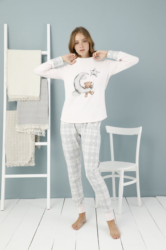 פיג’מה לנשים נעימה במיוחד עם הדפס דובי על ירח עם כוכב + מכנס משבצות