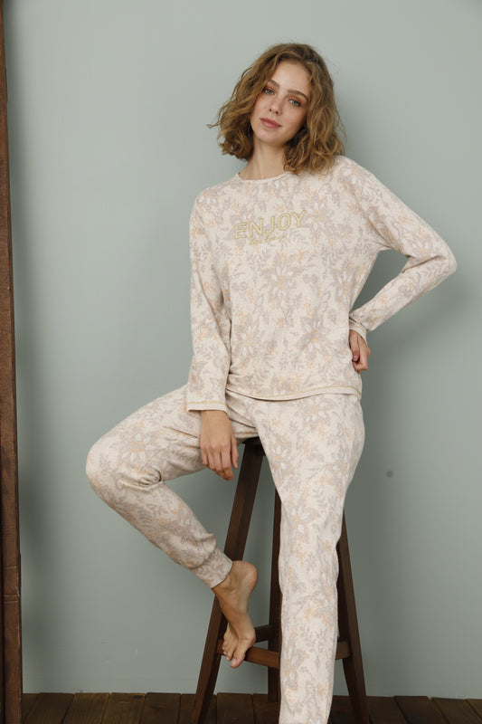 פיג'מה חמה לחורף לנשים סריג עדין פרחוני בצבע בז