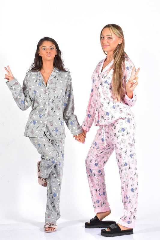 פיג`מה מכופתרת נשים\נערות לבן\ורוד\אפור