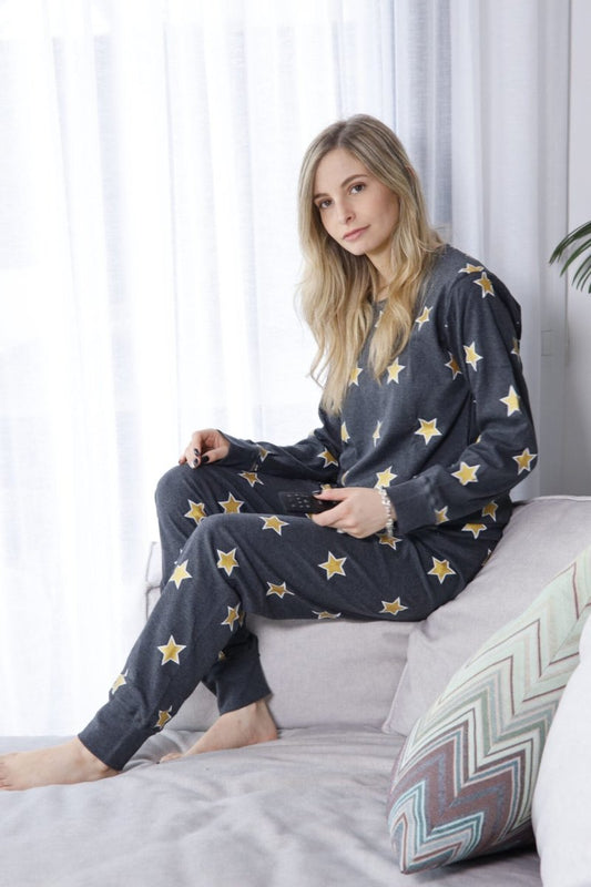 פיג`מה לנשים אינטרלוק 100% כותנה אפור עם כוכבים