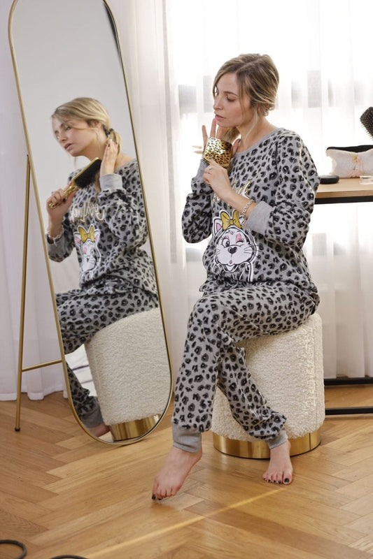 פיג`מה נשים\נערות 100% כותנה אינטרלוק צבע שחור\אפור כהה - חתולה