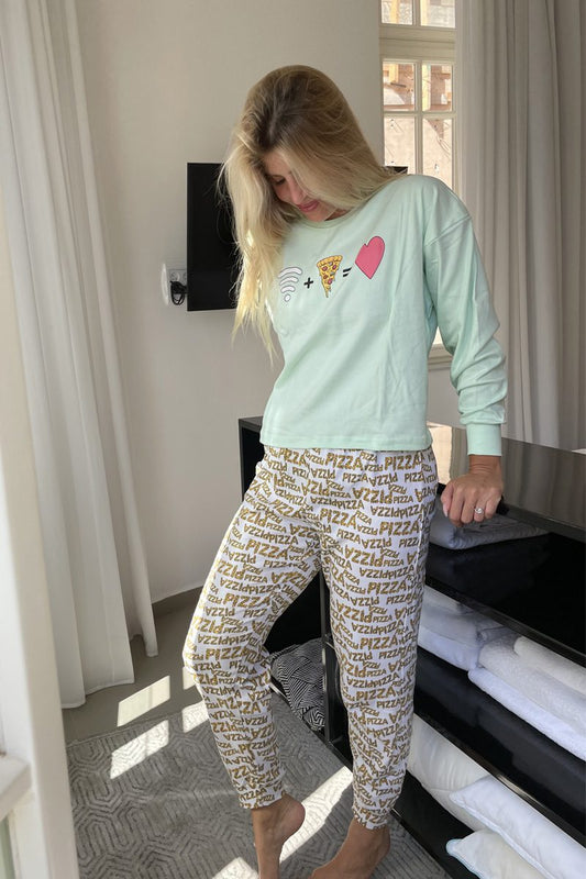 סט פיג'מה לנשים גו אנדר פיצה - 100% כותנה - חולצה מנטה(ירוק בהיר) שרוול ארוך ומכנס ארוך