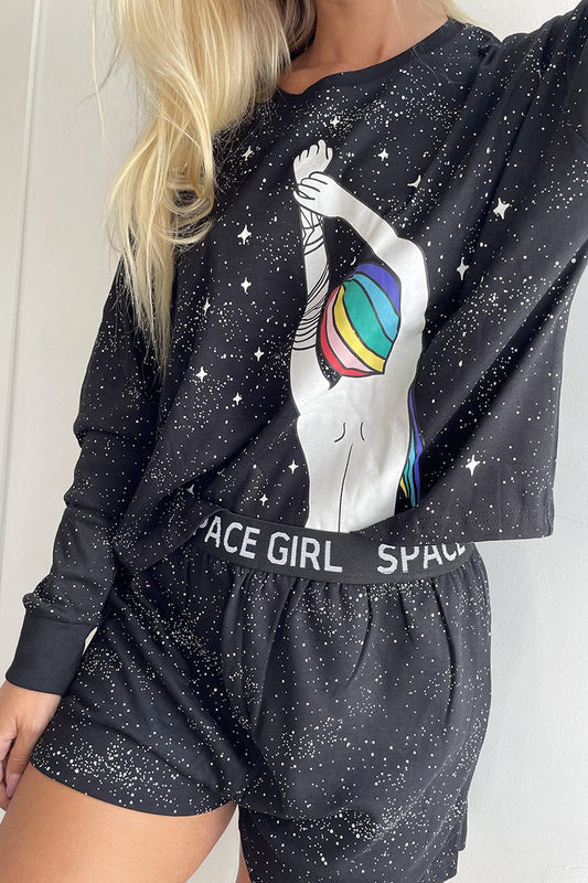 סט פיג'מה לנשים 100% כותנה גו אנדר(GO UNDER) שחורה עם כוכבים SPACE GIRL