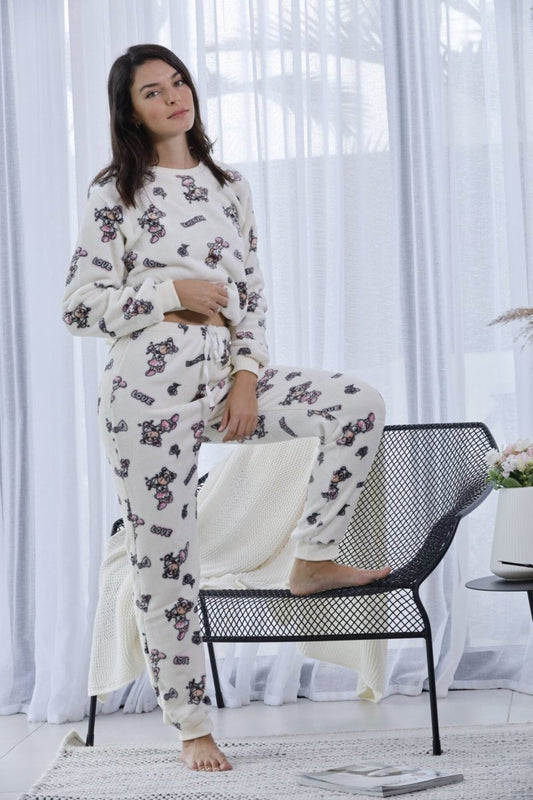 סט פיג'מה פליז דובונים לבן\ורוד\אפור בהיר