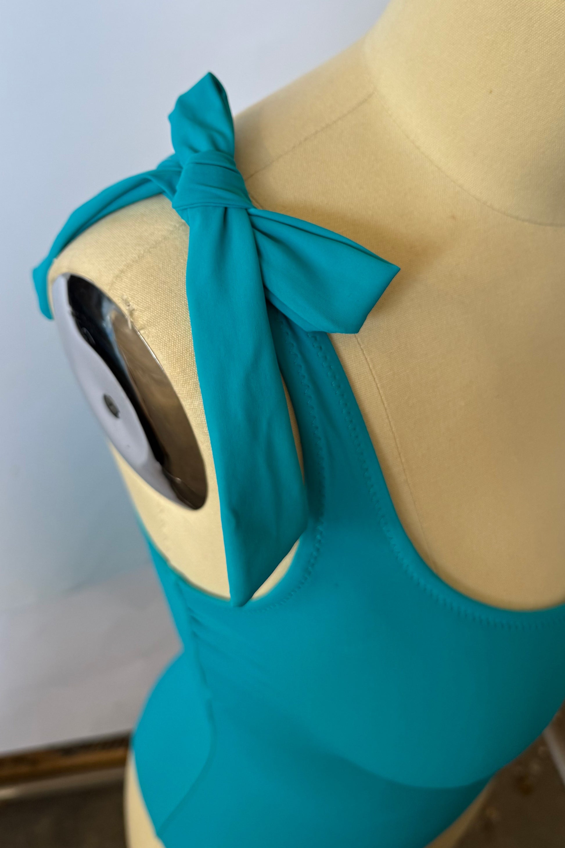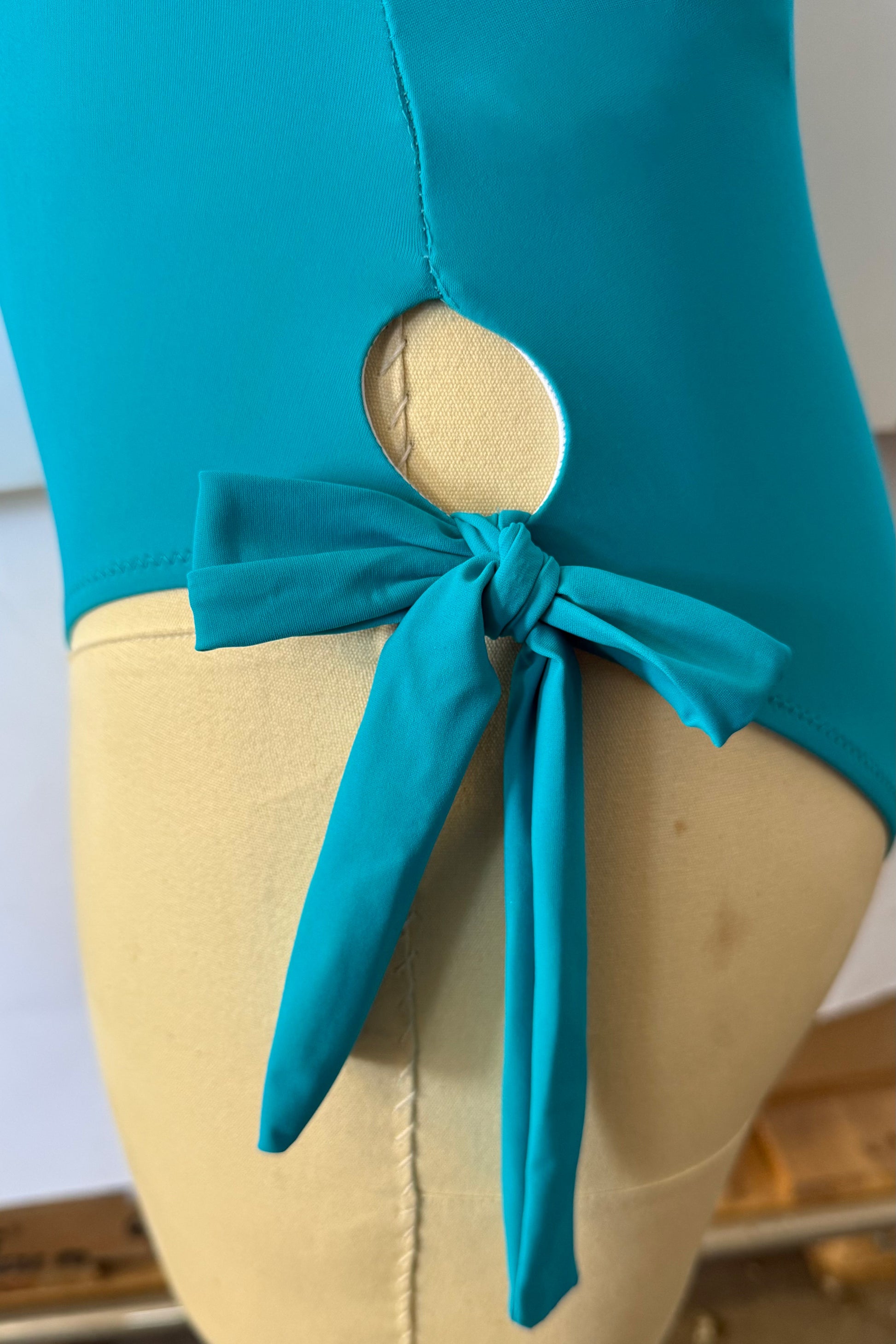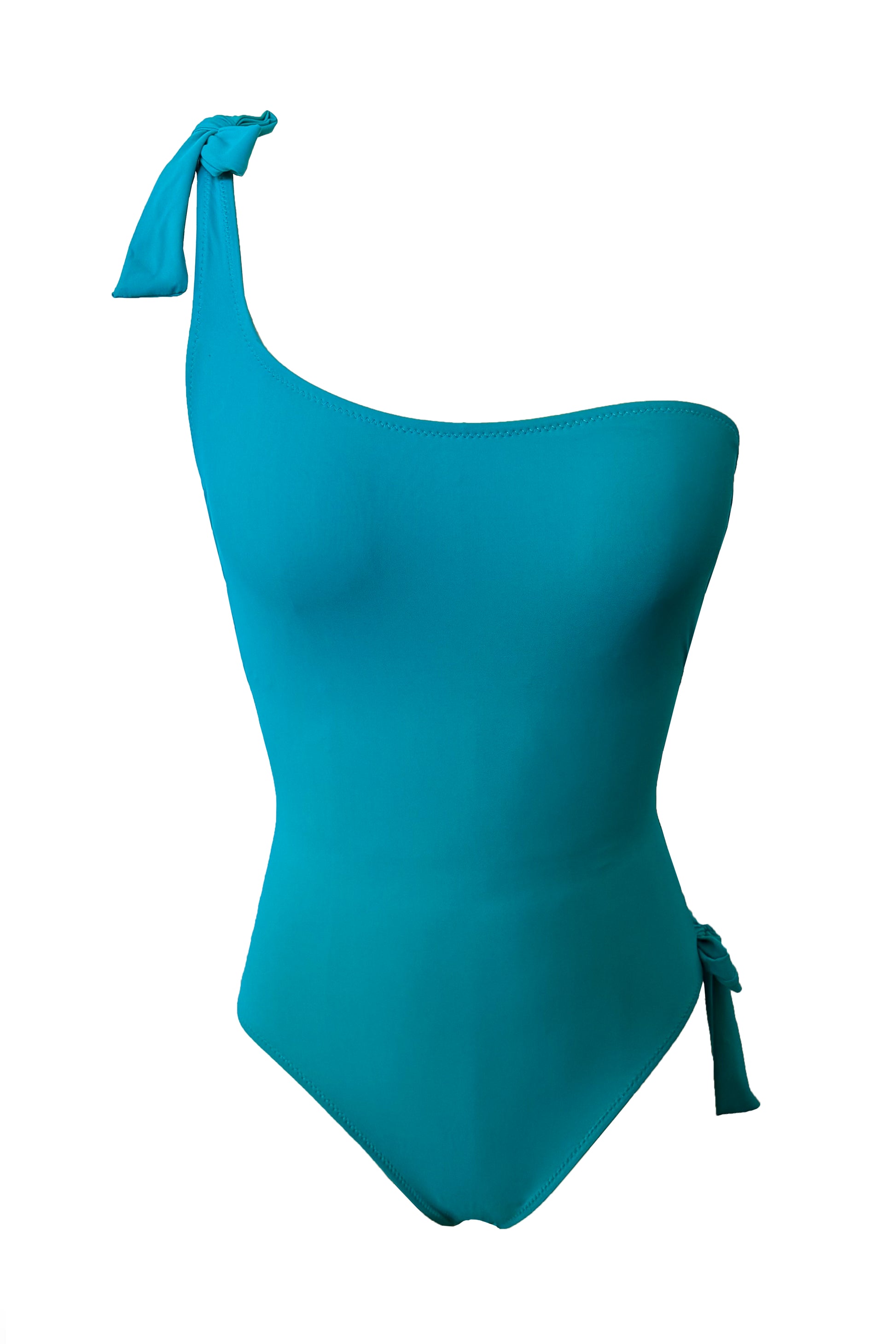 בגד ים שלם מחטב כתף אחת בצבע טורקיז.