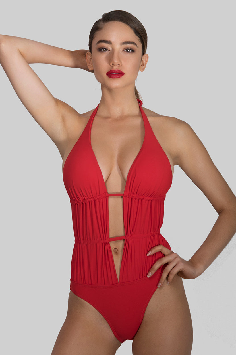 בגד ים שלם סקסי עם מחשוף V עמוק.