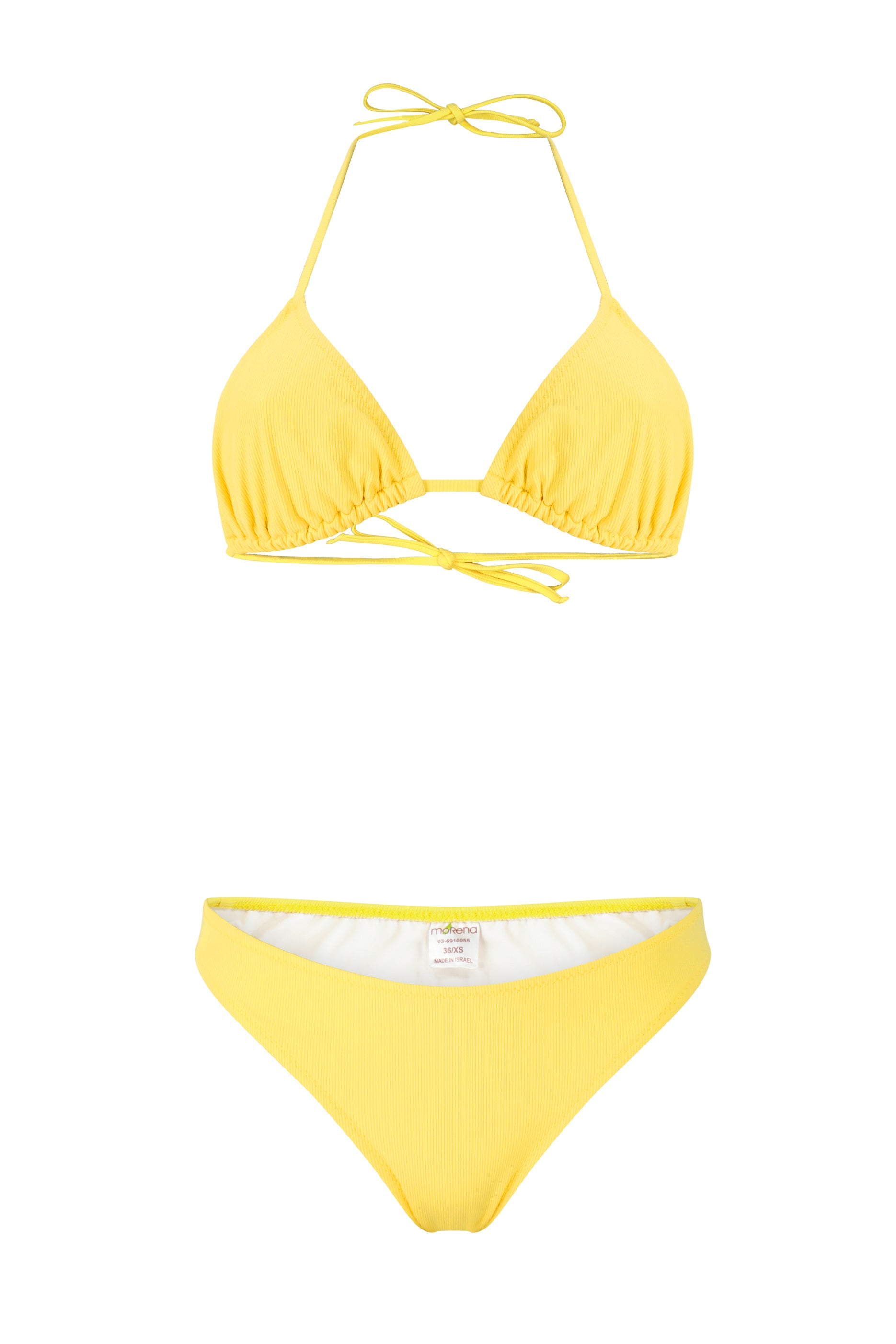 טופ ביקיני משולשים מבד ריב צהוב, עם רצועות ספגטי דקות וכרית עדינה למניעת שקיפות - הכרית ניתנת להסרה בקלות.
