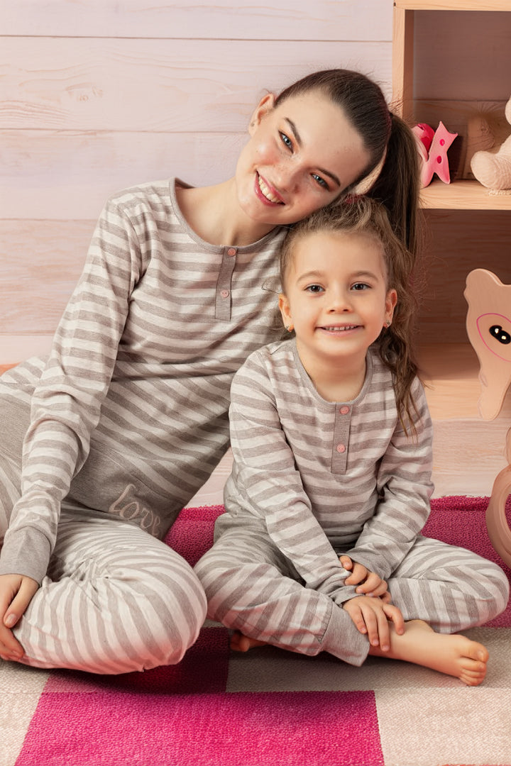 סט פיג'מה איכותי לנשים, חולצה עם מפתח צוואר עגול עם כפתורים ורודים ושרוולים ארוכים עם סיומת מנג'ט חום, החולצה בצבע חום פסים והכיתוב Love בחלקה התחתון ומכנס ארוך חום פסים עם סיומת מנג'ט חום - שילוב מושלם של סגנון ונוחות. הרכב הבד הינו תערובת מענגת של 95% כותנה ו-5% אלסטן, מה שמבטיח תחושה רכה, נושמת וגמישה.