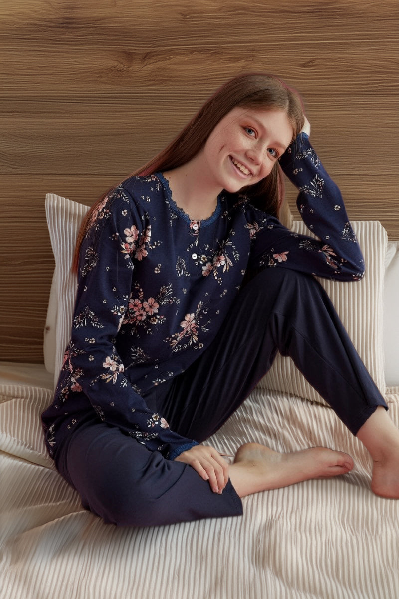 פיג'מה לנשים - חולצה בצבע כחול כהה עם מפתח עגול תחרה כחולה עם שני כפתורים ורודים עם הדפס פרחים ורודים שרוולים ארוכים, המכנס בצבע כחול כהה - שילוב מושלם של סגנון ונוחות. הרכב הבד הינו תערובת מענגת של 95% כותנה ו-5% אלסטן, מה שמבטיח תחושה רכה, נושמת וגמישה.