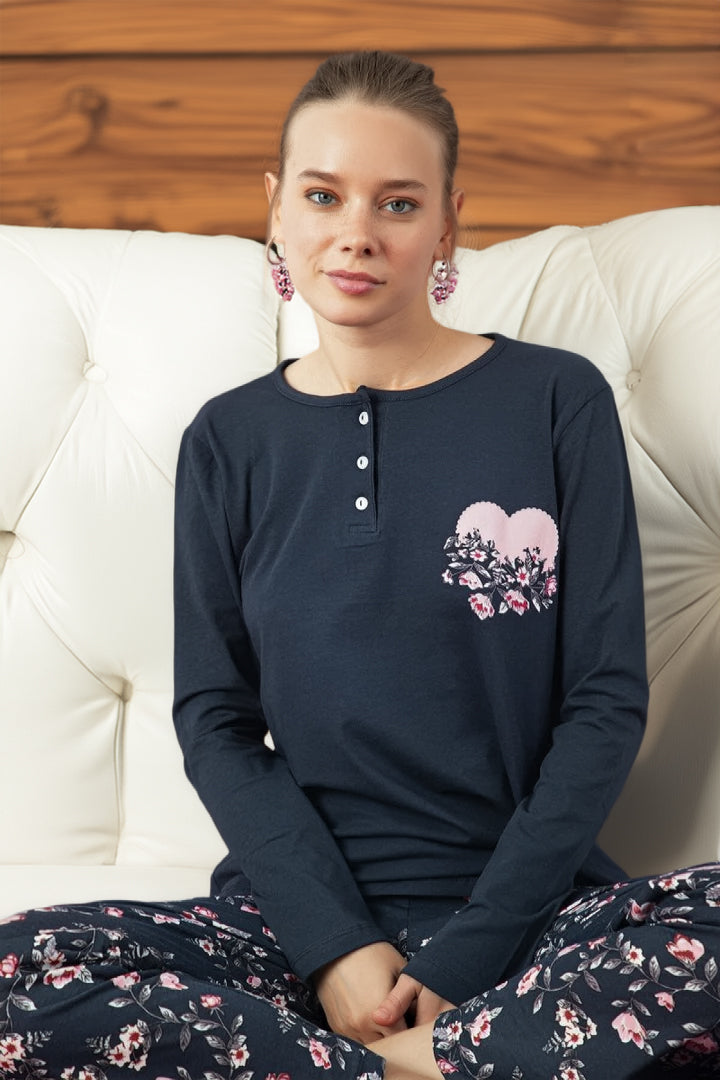 סט פיג'מה איכותי לנשים, חולצה עם מפתח צוואר עגול עם כפתורים ושרוולים ארוכים, החולצה בצבע כחול כהה ולב ורוד עם פרחים ורודים בצד שמאל ומכנס ארוך כחול כהה עם פרחים ורודים - שילוב מושלם של סגנון ונוחות. הרכב הבד הינו תערובת מענגת של 95% כותנה ו-5% אלסטן, מה שמבטיח תחושה רכה, נושמת וגמישה.