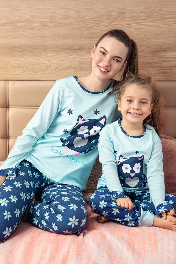 פיג'מה לילדות תכלת עם ינשוף כחול ומכנס כחול עם פרחים 95% כותנה