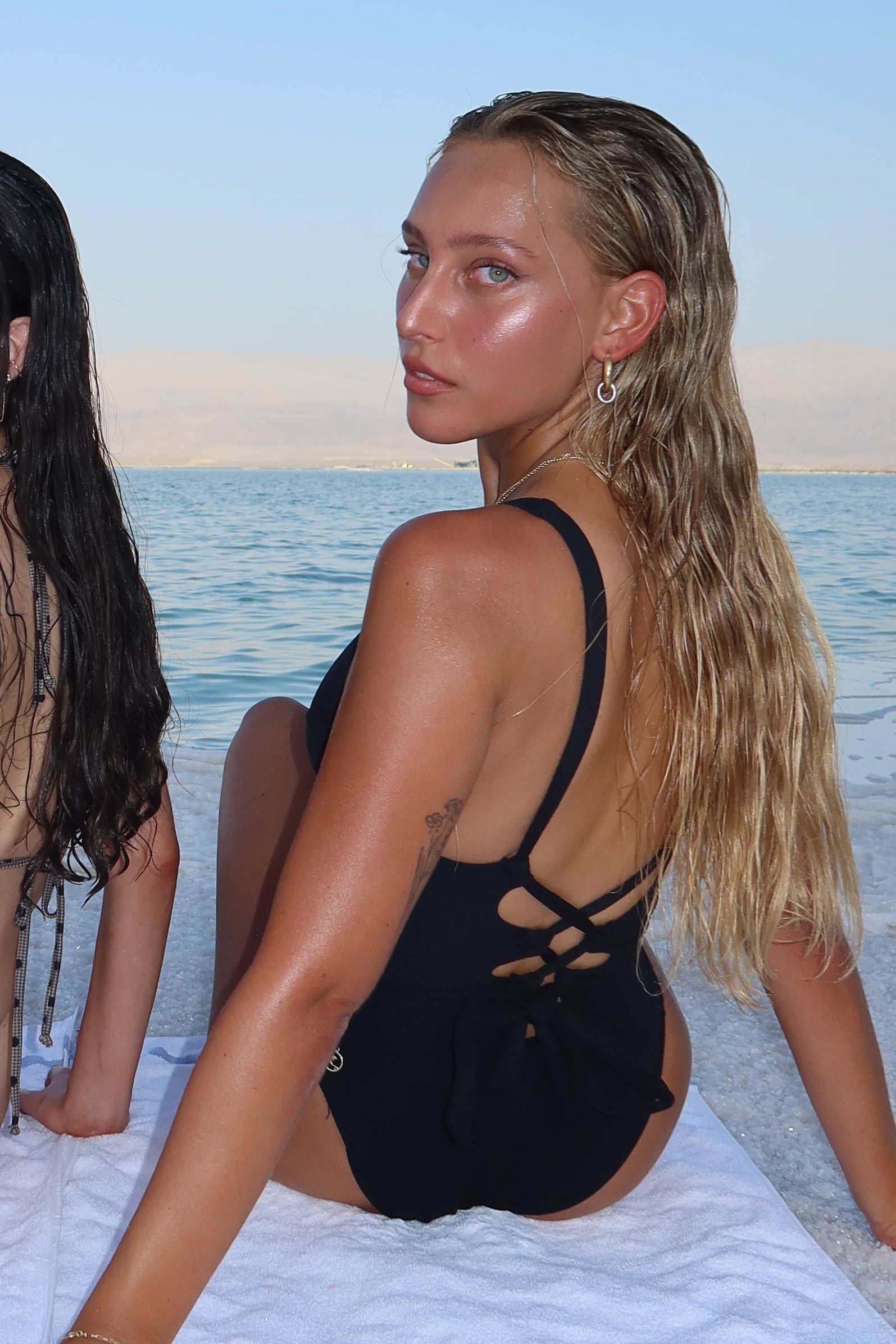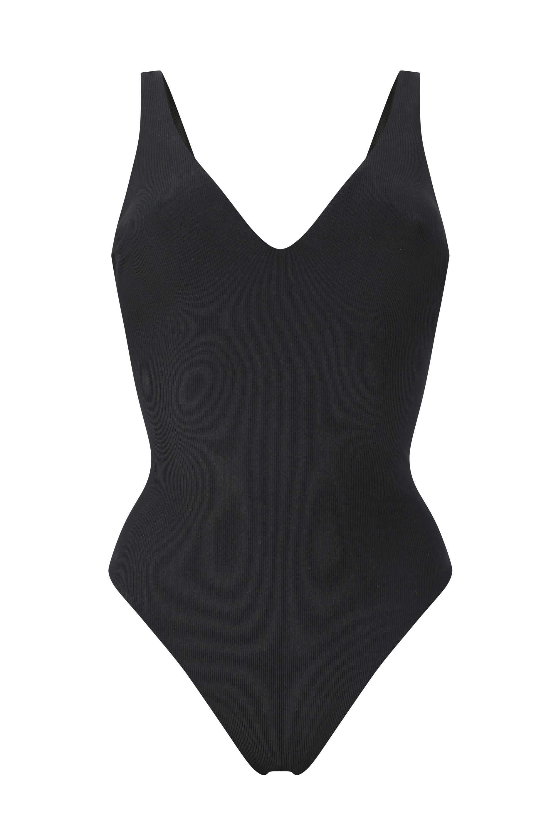 בגד ים שלם מחטב מבד ריב שחור עם מפתח וי,